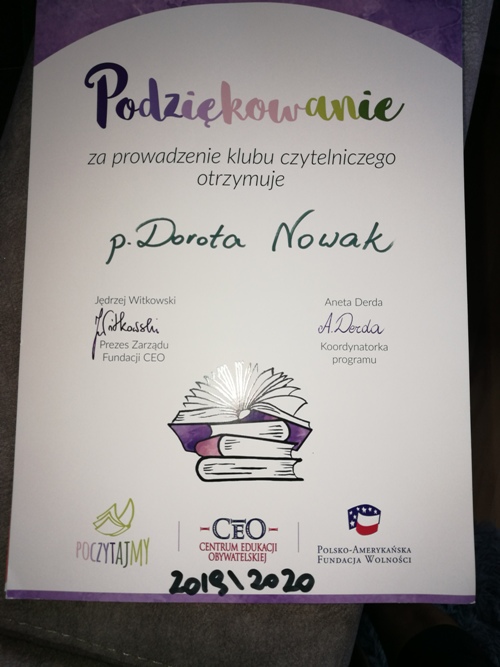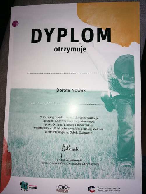 Liderem projektów była pani Dorota Nowak, której pomocy w realizacji działań udzielały panie z biblioteki szkolnej: Ewa Świątek i Mirosława Pawlicka – Pacyga. Praca młodzieży i opiekunów została doceniona w postaci podziękowań, dyplomów i drobnych upominków od organizatorów. Listy gratulacyjne otrzymała również dyrekcja szkoły.