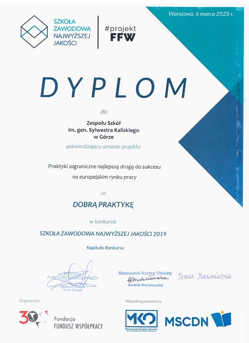 Projekt pt.: „Praktyki zagraniczne najlepszą drogą do sukcesu na europejskim rynku pracy” realizowany w ramach programu Erasmus+ w Zespole Szkół w Górze został uznany za Dobrą Praktykę w konkursie Szkoła Zawodowa Najwyższej Jakości 2019.